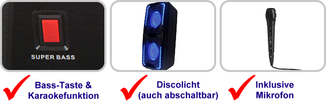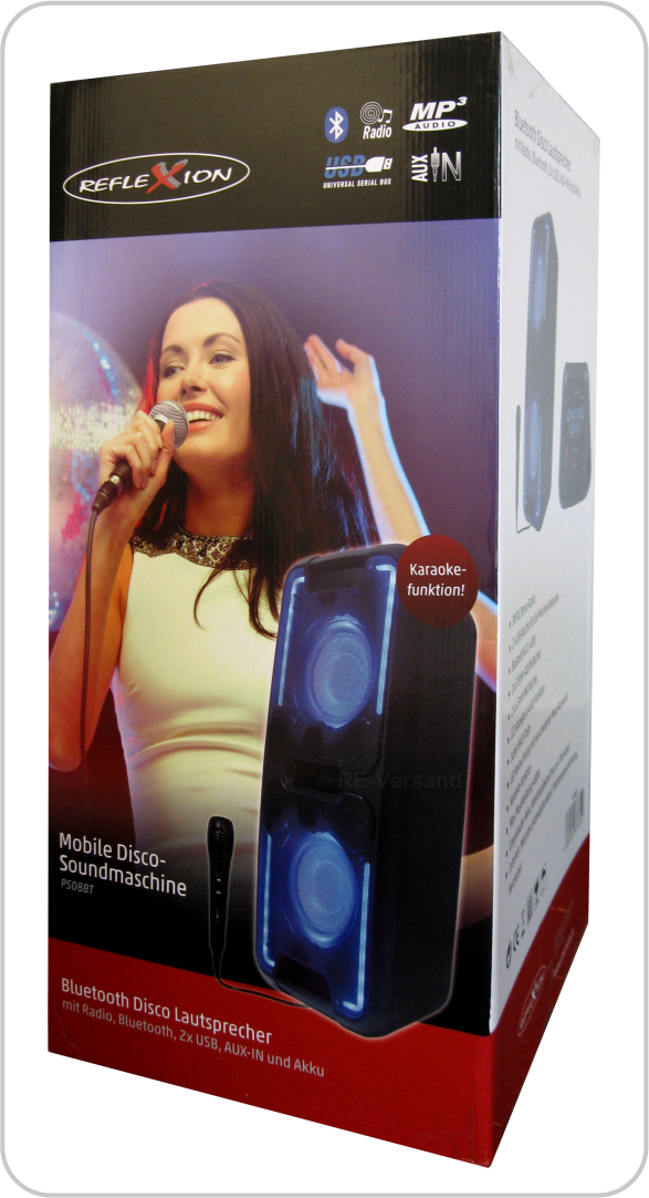Innovative und top ausgestattete Reflexion PS08BT mobile Discosoundmaschinen mit Bluetooth, Radio, 2x USB, AUX-IN, Mikrofon, Karaokefunktion, eingebautem Akku und zuschaltbarem LED-Licht, das zum Beat blinkt, zu verkaufen.