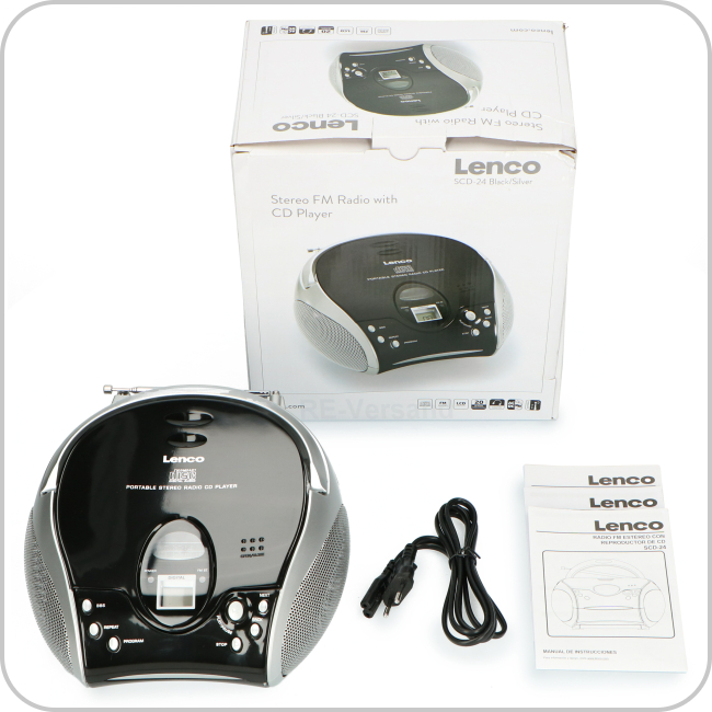 Gerät (Farbe: Schwarz / Silber), ausführliche Bedienungsanleitung in Deutsch, Netzanschlusskabel, gedruckte Rechnung.